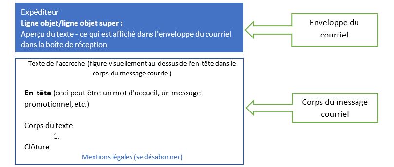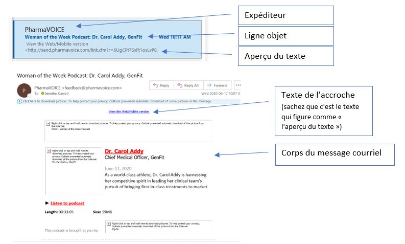 Peu importe la terminologie utilisée, il faut que l'ensemble du contenu affiché aux yeux du destinataire avant l'ouverture du courriel (l'enveloppe du courriel) soit divulgué au CCPP de façon claire.