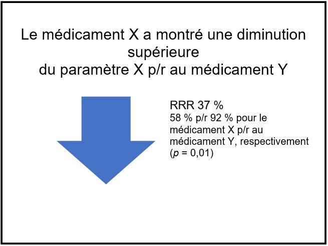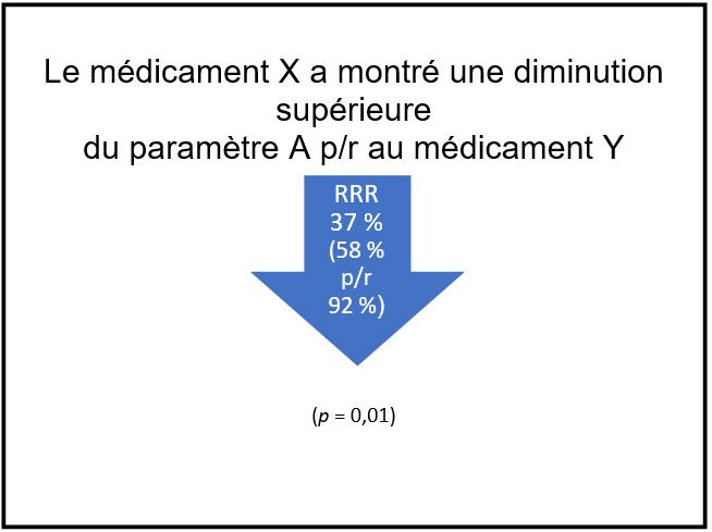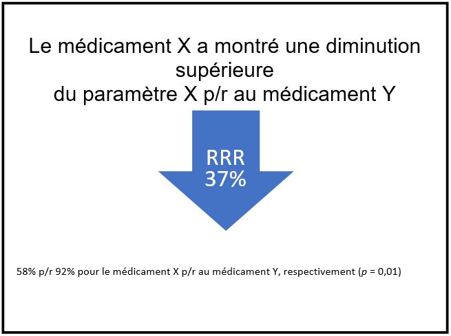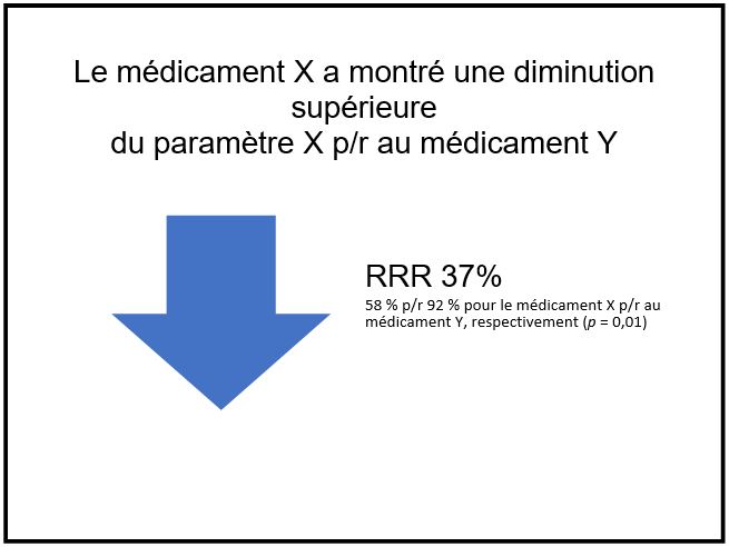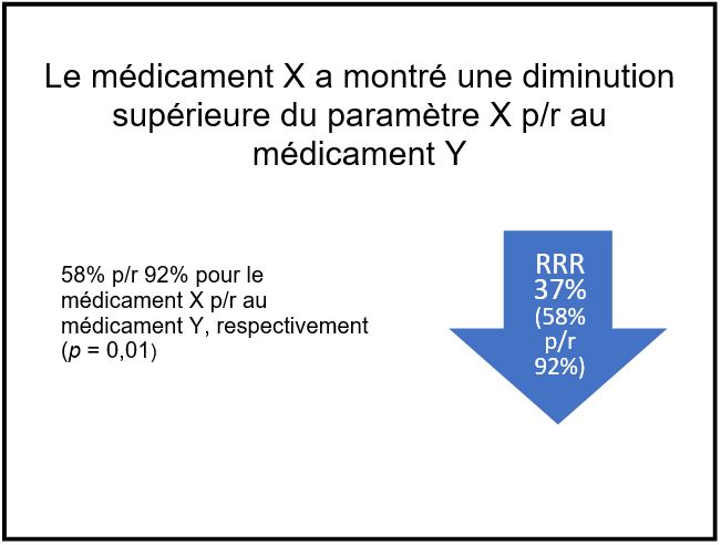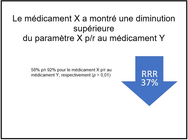 La présentation des résultats d'essais cliniques en termes relatifs ou proportionnels peut mener à une interprétation erronée du bienfait réel et de l'ampleur de l'effet du traitement. Les SPP qui ont recours à ces méthodes pour présenter les résultats, p. ex., le risque relatif (RR) ou la réduction du risque relatif (RRR), doivent aussi préciser l'effet du traitement en termes absolus, p. ex., la réduction du risque absolu, le nombre de sujets à traiter ou encore, les résultats cliniques ou les taux comparatifs réels. La présentation dans son ensemble doit refléter l'ampleur réelle du bienfait et ne pas amplifier l'effet clinique. Il n'est pas acceptable d'accorder une importance indue aux effets du traitement présentés en termes relatifs en ayant recours à des graphiques ou à des caractères d'une police de caractère différente.