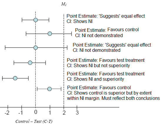 - ne traverse ou ne touche pas la marge de non-infériorité prédéfinie (M 1 dans la figure ci-dessus);