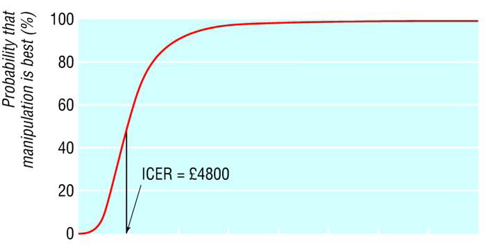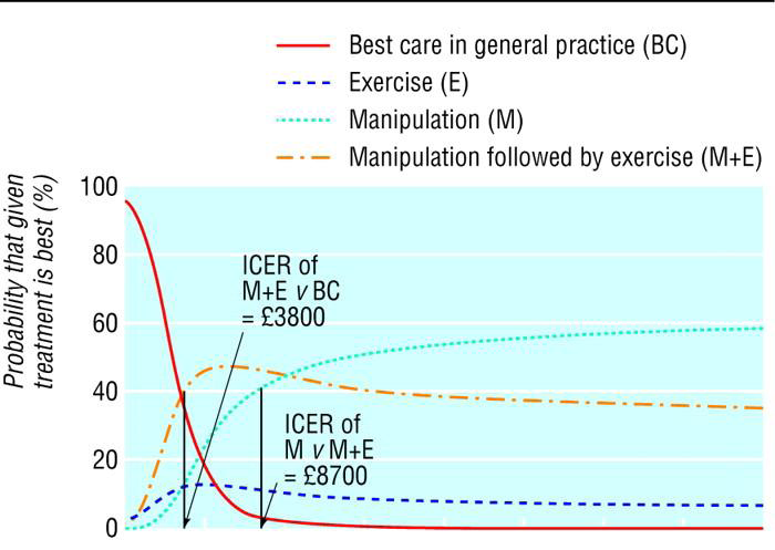 Meilleurs soins en médecine générale (MS) Exercice (E) Manipulation (M) Manipulation suivie d’exercice (M+E) Probabilité que le traitement donné soit la meilleure intervention (%) RCED de M+E MS = 3 800 £ RCED de M M+E = 8 700 £ |