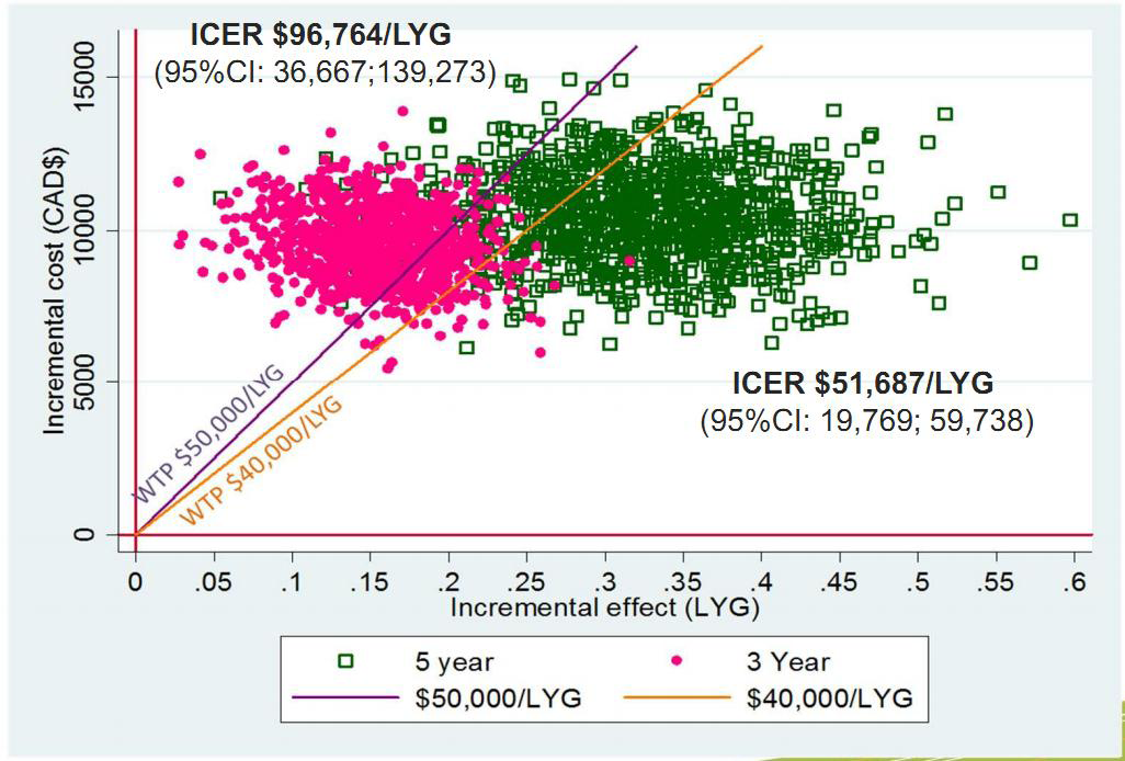 | « [Comparativement à [stratégie X], [stratégie Y] est une solution de rechange efficiente. (D’après une disposition à payer 100 000 $ pour une AVAQ (année de vie ajustée en fonction de la qualité) » Note de bas de page « [Stratégie Y] a mené à une augmentation moyenne de 300 $ et de 0,1 AVAQ par patient ». |