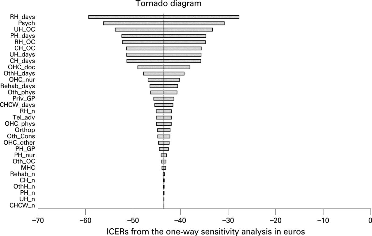 Décrire les conséquences de l’incertitude sur l’échantillonnage sur le coût différentiel estimé et les paramètres d’efficacité différentiels ainsi que les répercussions des hypothèses méthodologiques (c.-à-d. horizon temporel, perspective de l’étude). Une analyse de sensibilité univariée (déterministe) ou une analyse de sensibilité multivariée (probabiliste) sont appropriées. Il faut minimalement présenter une analyse de sensibilité univariée en utilisant un graphique Tornado qui comprend tous les paramètres d’efficience. Pour les analyses de sensibilités probabilistes, un diagramme de dispersion ou une courbe d’acceptabilité du rapport coût-efficacité sont appropriés. Pour permettre l’interprétation, il faut fournir les valeurs, étendues, références et, le cas échéant, les formes de répartition pour tous les paramètres. Des exemples en sont fournis dans l’Annexe.