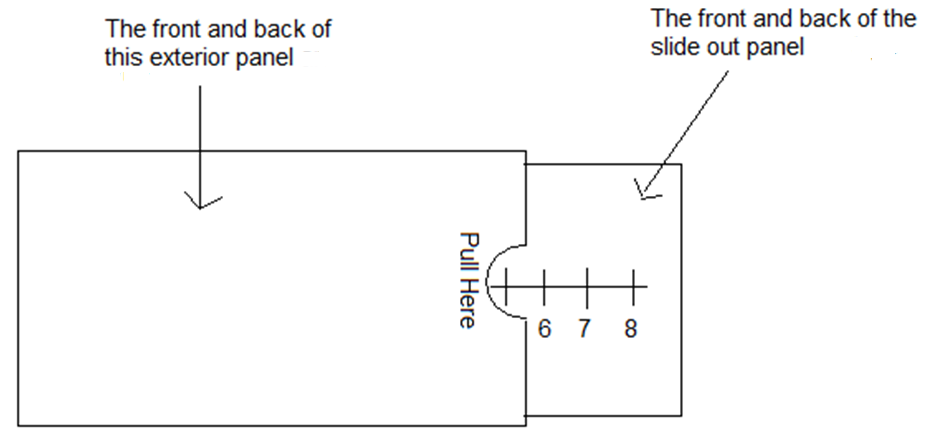 Pour une règle coulissante (voir à la Figure 10), la surface publicitaire principale est confinée en règle générale aux faces extérieures (recto et verso). La règle elle-même, qui coulisse, ne fait pas partie de la surface publicitaire principale. Le fabricant a le choix de placer un niveau moyen d’énoncé de juste équilibre sur la face externe, pour indiquer au lecteur qu’il doit enlever la règle pour accéder au niveau ultime d’énoncé de juste équilibre. Il est même possible que la règle se déplie, ce qui offre une plus grande surface. Le lecteur replie ensuite la règle et la glisse facilement en place dans l’étui pour continuer à utiliser l’outil publicitaire.