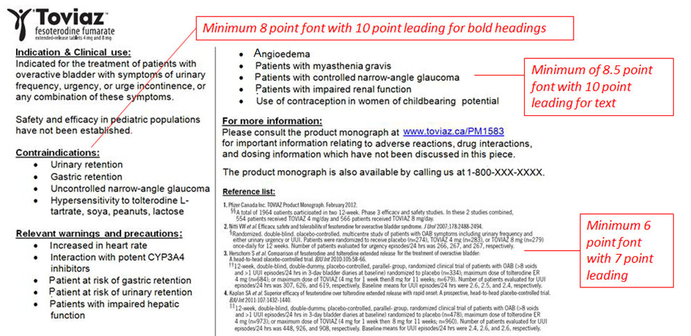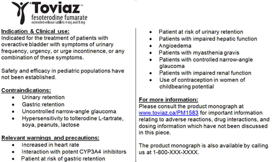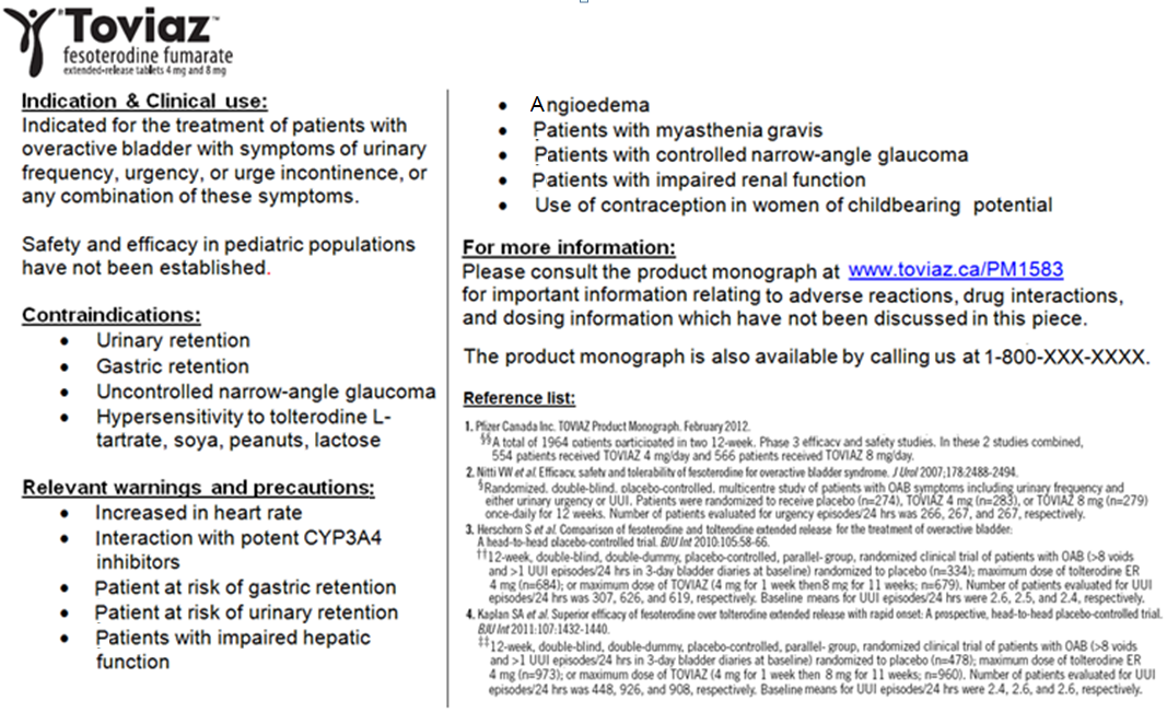 Étant donné que Toviaz ne comporte pas de mises en garde et précautions mises en évidence (c.-à-d. en caractères gras/encadrées) ni une longue liste de problèmes liés à l’usage clinique dans la section « Indications et usage clinique » de la monographie du produit, les avantages de l’utilisation d’un niveau moyen d’énoncé de juste équilibre à l’intérieur du message publicitaire pour orienter les professionnels de la santé vers un niveau ultime à un autre endroit, ne sont pas aussi prononcés qu’ils le seraient pour d’autres produits.