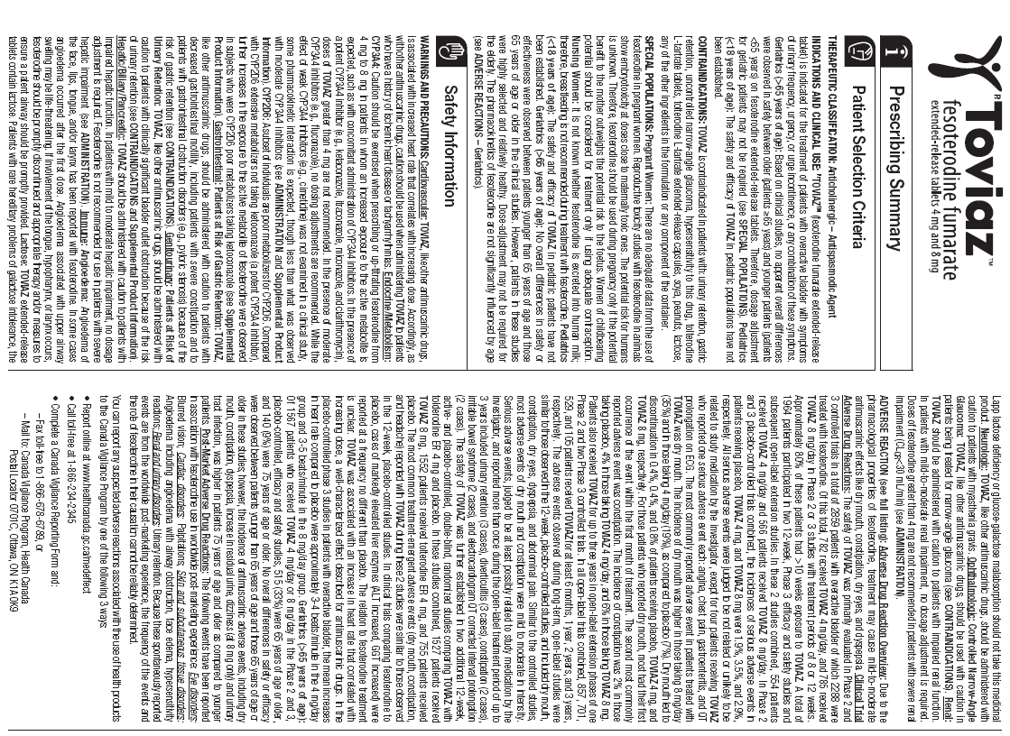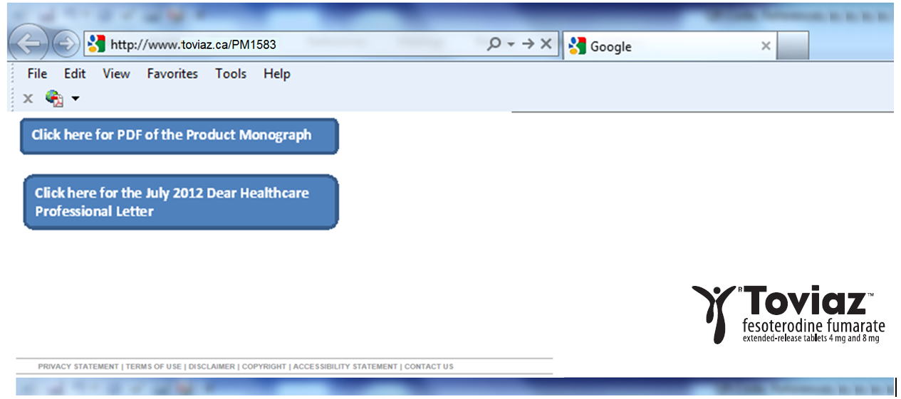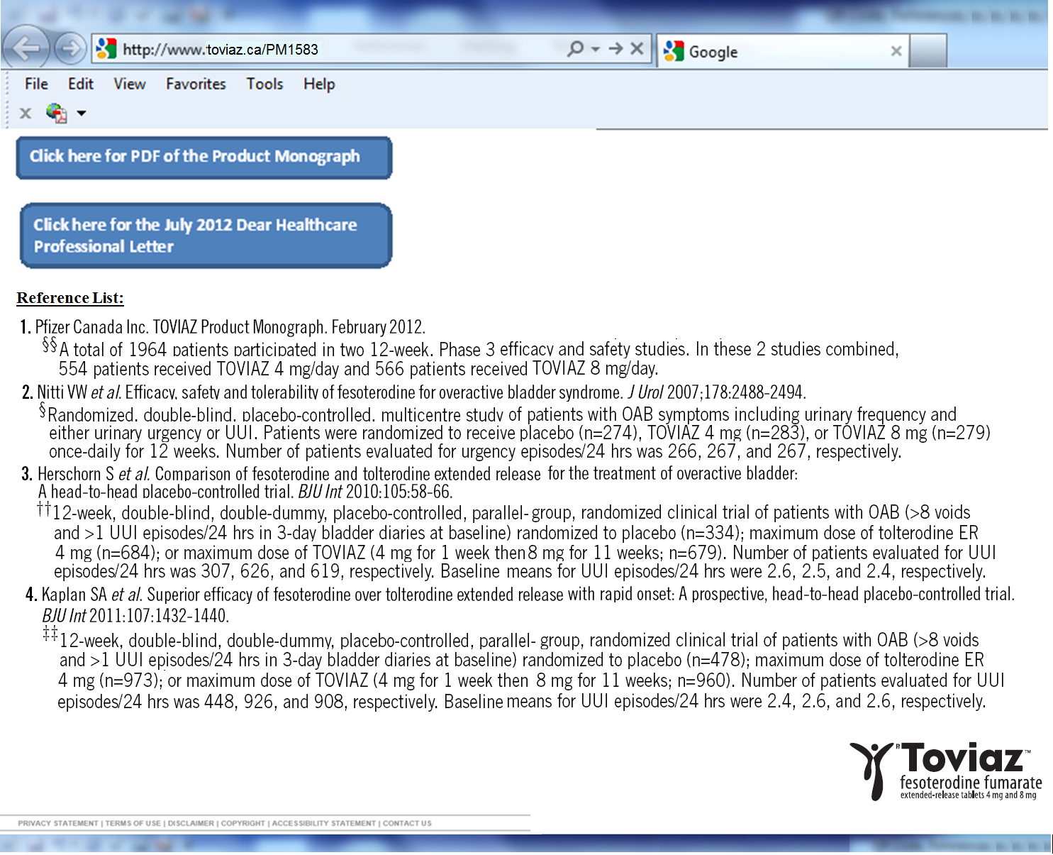 Conformément à l’article 7.3 du code du CCPP, cette page doit être accessible sans avoir à taper un mot de passe. Cela est possible étant donné que le SPP qui renferme l’adresse URL est distribué ou rendu visualisable d’une façon contrôlée (c.-à-d. ciblée pour les professionnels de la santé). Par conséquent, l’adresse URL elle-même sert de clé d’entrée dans le site Web sur Toviaz. C’est pour cette raison que vous observerez que l’adresse URL n’est pas simplement www.toviaz.ca . La révision de cette page Web par le CCPP n’est pas nécessaire à condition que le contenu soit limité au contenu détaillé dans l’article 7.3.2b du code du CCPP. Les références et les paramètres d’études sont révisés dans le contexte du SPP correspondant.