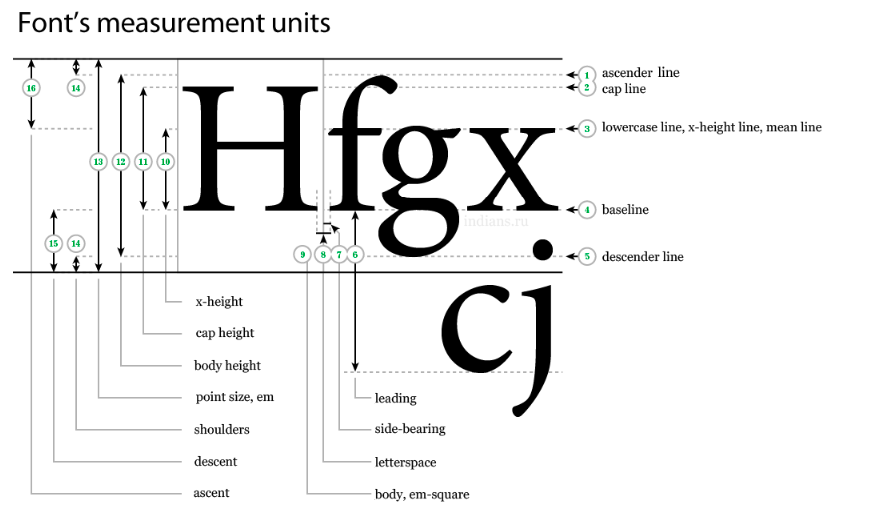 In the first diagram, notice how point size (13) includes the spacing above (16) and below (15) the x- height (10). The font designer will determine the degree of this spacing, and so a 12pt font from one typeface may have a different x-height than the 12pt font from another one. Therefore, the x-height and cap height (11) are key considerations for PAAB review, as these more accurately reflect the amount of space the characters occupy inside the em-square (9).