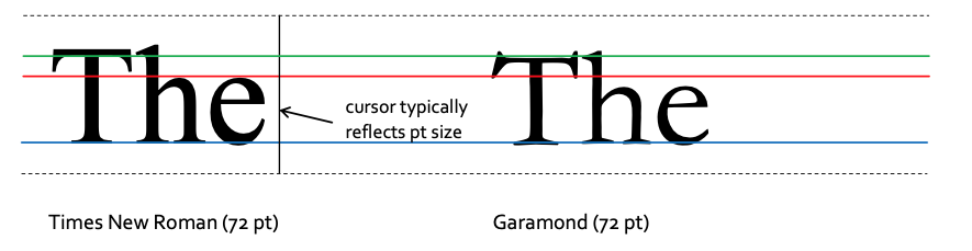 The example illustrating the differences between Times New Roman and Garamond has not been bolded or manipulated in any way. Measuring from the blue line , the red line represents TNR’s x -height and the green line represents Garamond’s cap height. For the x-height , notice how the height of the “e” and the shoulder of the “h” are smaller in Garamond than in TNR. For the cap height , the stem of the “T” is shorter in Garamond (note: the serifs do not count towards the cap height). The result is that Garamond characters appear smaller in the final printed piece.