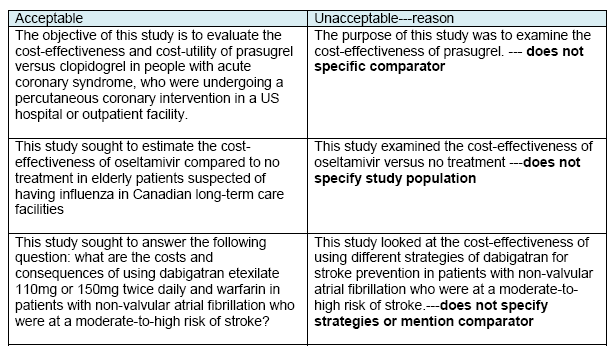 Describe the competing strategies being compared with details of the specific interventions being compared (drug, form, dose etc.), the health care setting and the target (patient) population. It is not enough to state that ‘The purpose of the study was to assess the cost-effectiveness of treatment X’. Examples of acceptable and unacceptable questions are available in the Appendix to this Supplement.