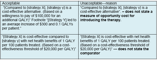 When a therapy is reported to be “cost-effective” and is associated with increased costs, this must be accompanied by a similarly-sized declaration of the measure of opportunity cost used to qualify the claim. This can be phrased as either a “cost-effectiveness threshold” or a decision-maker’s “willingness to pay” for an extra unit of effectiveness. (See Examples in Appendix)
