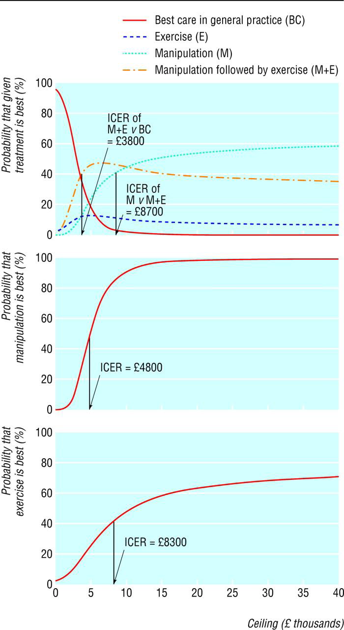 3) Cost-effectiveness acceptability curve of competing interventions given joint parameter uncertainty and separate comparisons of different treatment scenarios.
