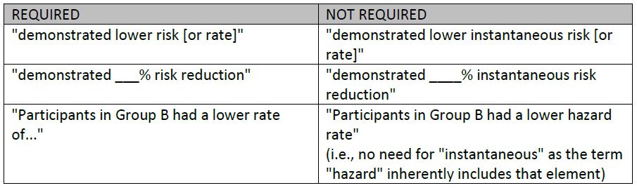 Note that it would be inaccurate to represent this claim of "10% fewer participants..." as a reduction in instantaneous risk, as timepoint/milestone analysis utilizes cumulative risk (i.e., the y-axis) as opposed to instantaneous risk (i.e., the hazards). Provision 6 below does not apply to timepoint/milestone analysis.