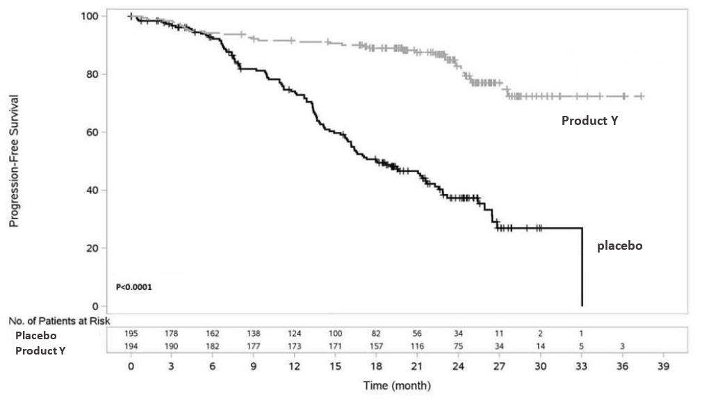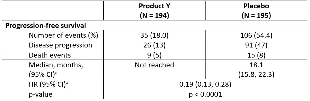 Product Y demonstrated superior PFS compared with placebo: 81% reduction in instantaneous risk of progression or death vs. placebo (HR: 0.19 [95% CI: 0.13 ‑ 0.28]; p<0.0001)