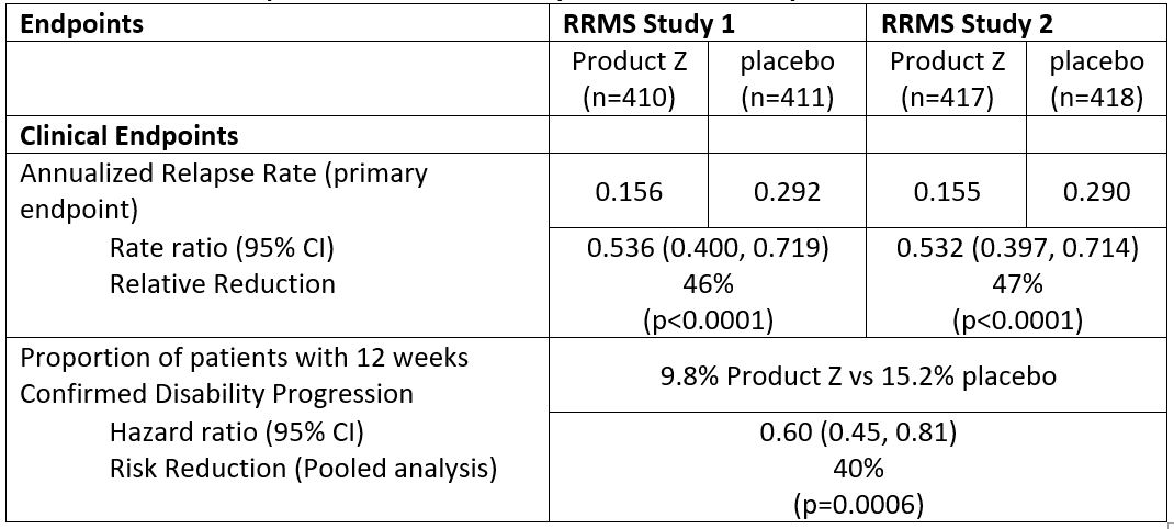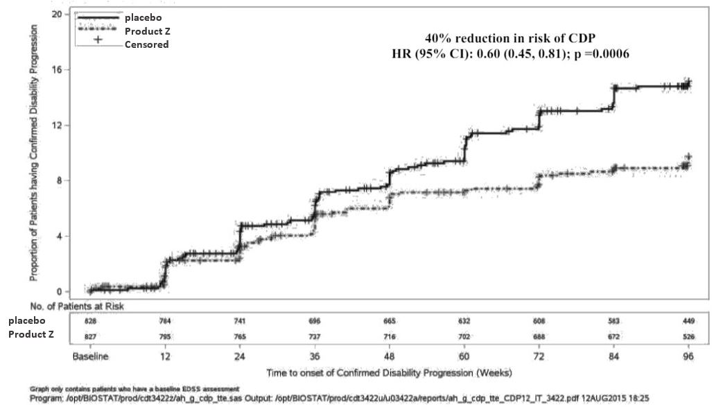 Product Z demonstrated 40% reduction in instantaneous risk of patients experiencing 12-week confirmed disability progression compared with placebo (HR 0.60 [95% CI: 0.45-0.81]; p=0.0006)