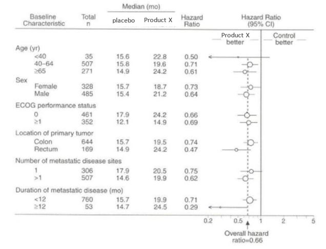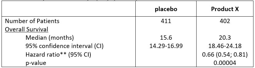 Product X significantly delayed time to death vs. placebo: 20.3 months vs. 15.6 months (HR 0.66 [95% CI: 0.54-0.81]; p=0.0004)
